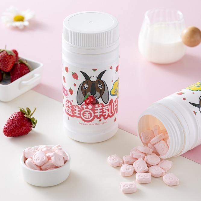 益生菌羊乳片採用 100% 山羊奶粉 製成, 羊乳本身含有蛋白質、礦物質及多種營養成分, 口感溫和,適合作為日常飲食中的營養補充。