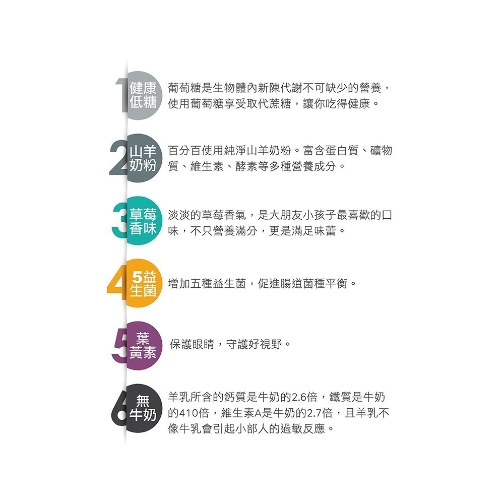 配方中添加 五種益生菌: 胚芽乳桿菌、副乾酪乳桿菌、屬李糖乳桿菌、乳酸乳球菌、加氏乳酸桿菌, 搭配羊乳基底,提供多元配方選擇。