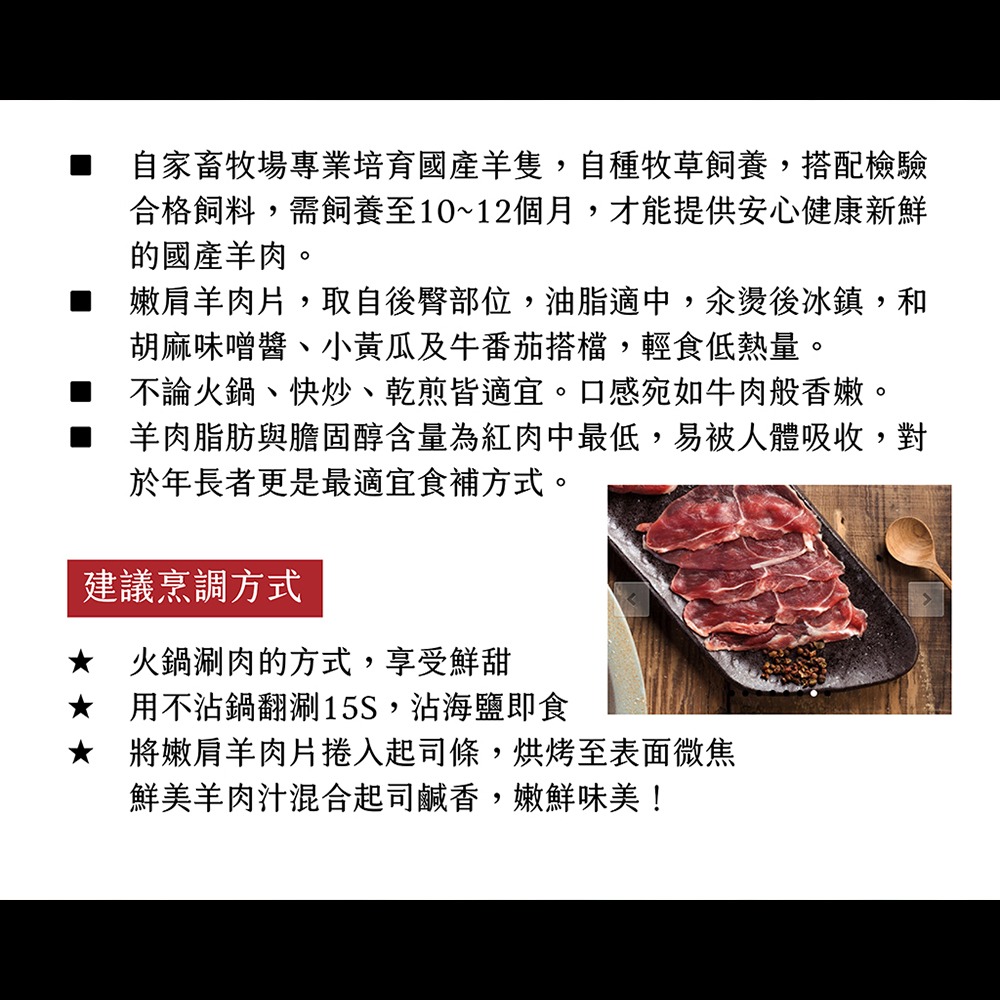 ■ 自家畜牧場專業培育國產羊隻,自種牧草飼養,搭配檢驗合格飼料,需飼養至10~12個月,才能提供安心健康新鮮的國產羊肉。